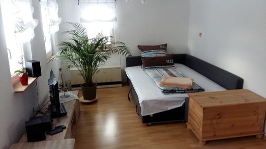 Eine weitere Schlafmöglichkeit befindet sich im Wohnzimmer. Das Sofa lässt sich zu einem Bett umbauen. Liegefläche 1,4 x 2 m