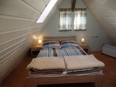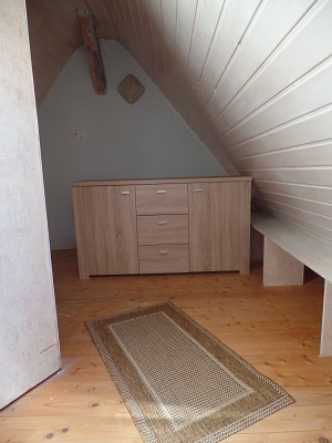 Im Dachgeschoss befindet sich das Schlafzimmer mit einem Französischen Bett ( 1,4 x 2,0 m ) und begehbarem Schrank